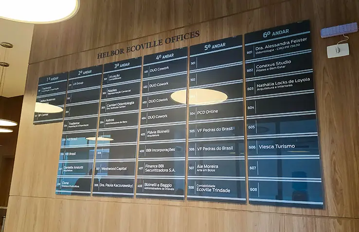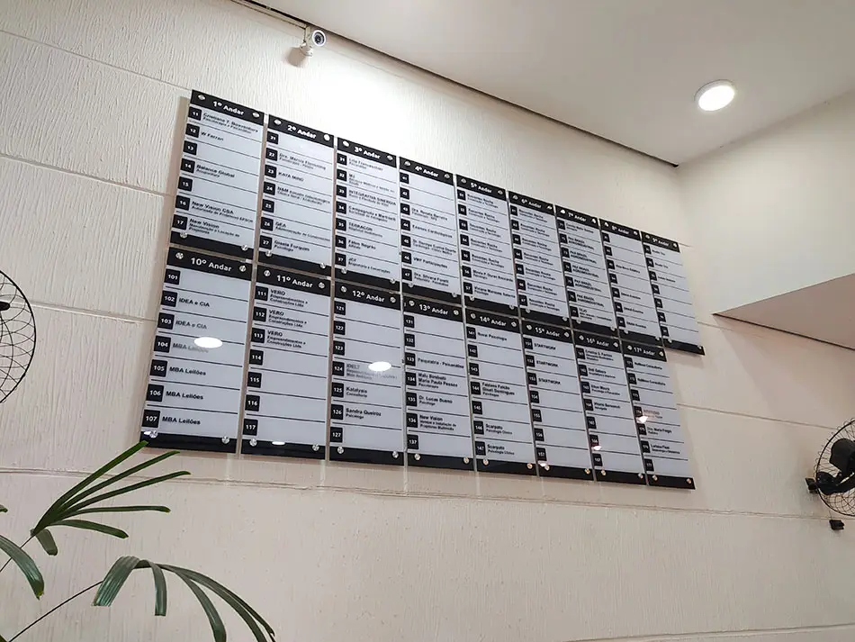 Esses painéis são projetados para organizar e apresentar as informações de forma clara e legível, tornando mais fácil para as pessoas encontrarem os escritórios, clínicas, consultórios ou qualquer outra atividade que estejam procurando dentro do edifício. Eles podem ser personalizados para incluir os andares, números de sala e o nome e logotipo das empresas.